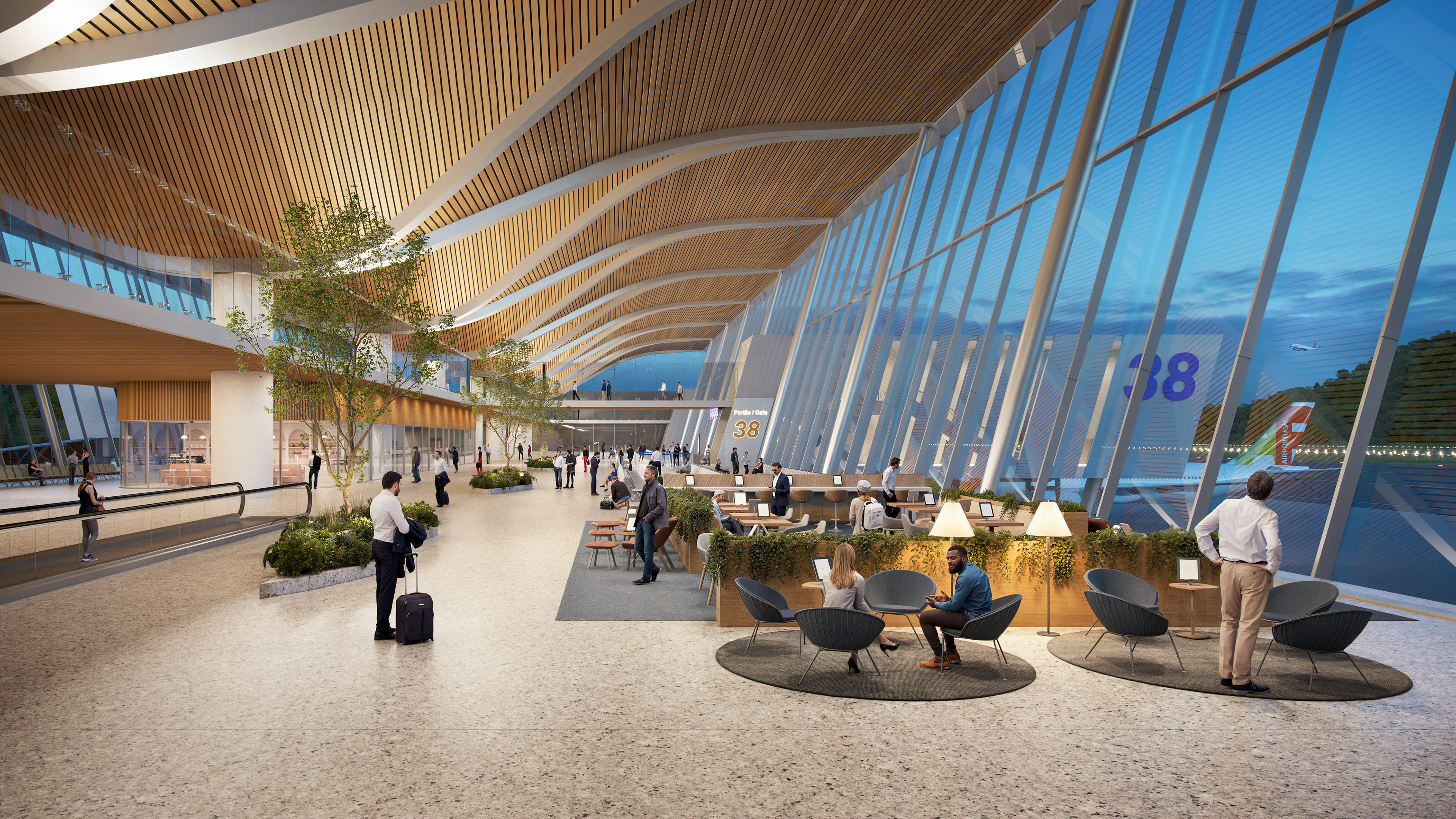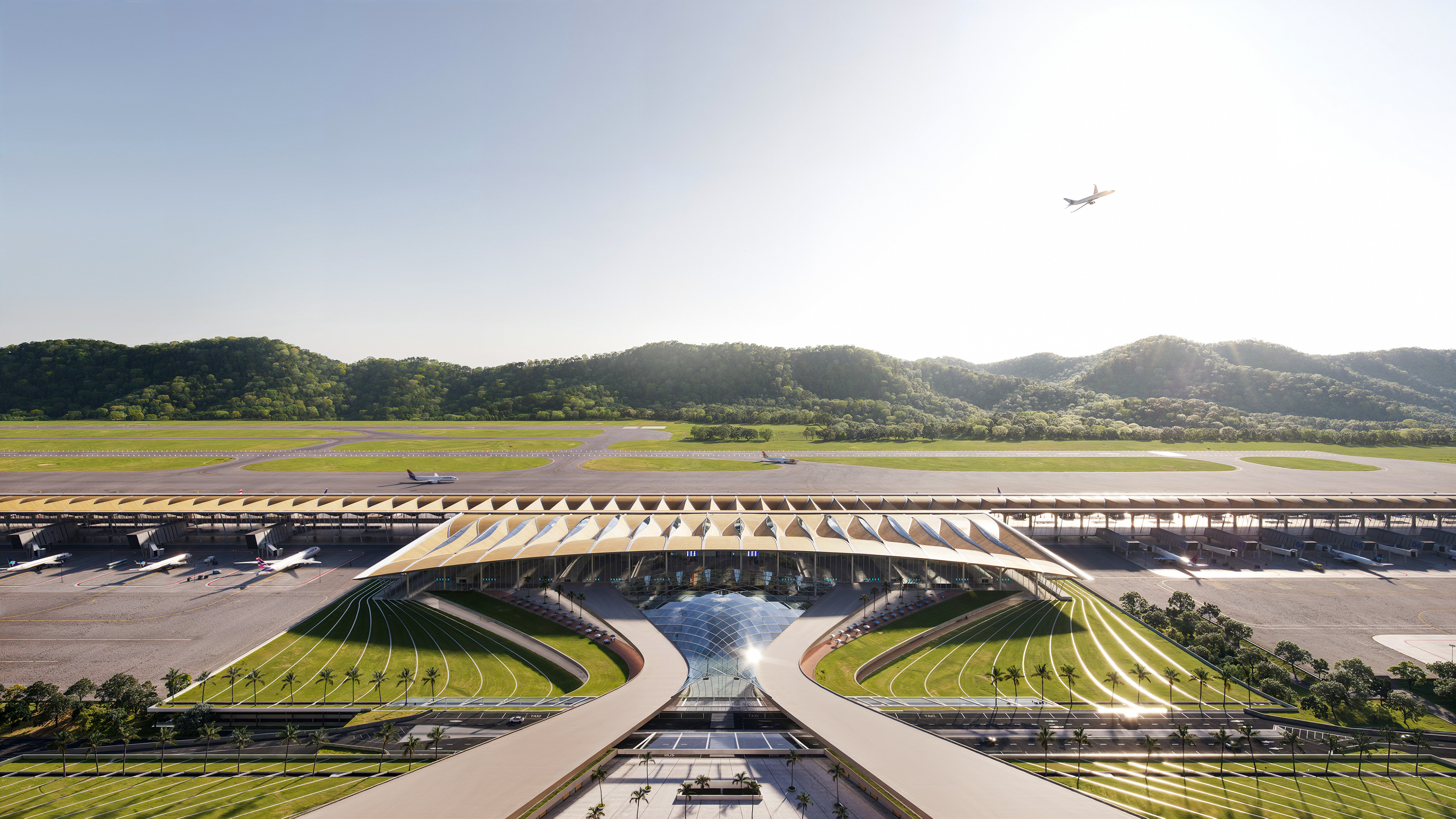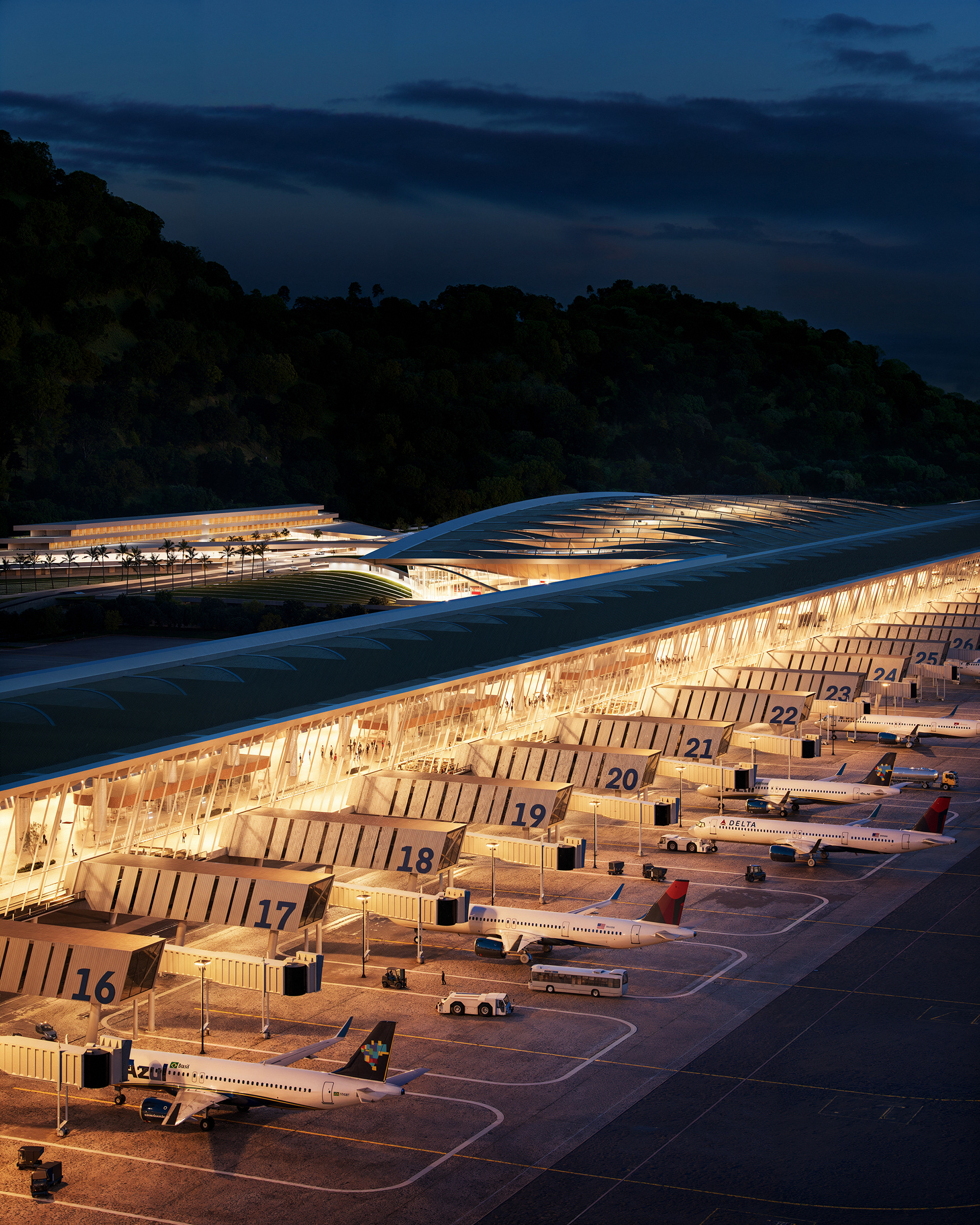 A Oliveira Cotta, escritório de arquitetura parceiro recorrente em nossos projetos mais desafiadores, nos procurou com urgência singular. Haviam desenvolvido proposta para concorrência de aeroporto regional — arquitetura imponente, escala monumental, complexidade técnica refinada. O grupo investidor desistiu da região, mas os arquitetos reconheceram que aquele projeto não poderia morrer em gavetas digitais. Precisava existir visualmente, funcionar como carta de apresentação para grandes grupos aeroportuários internacionais.