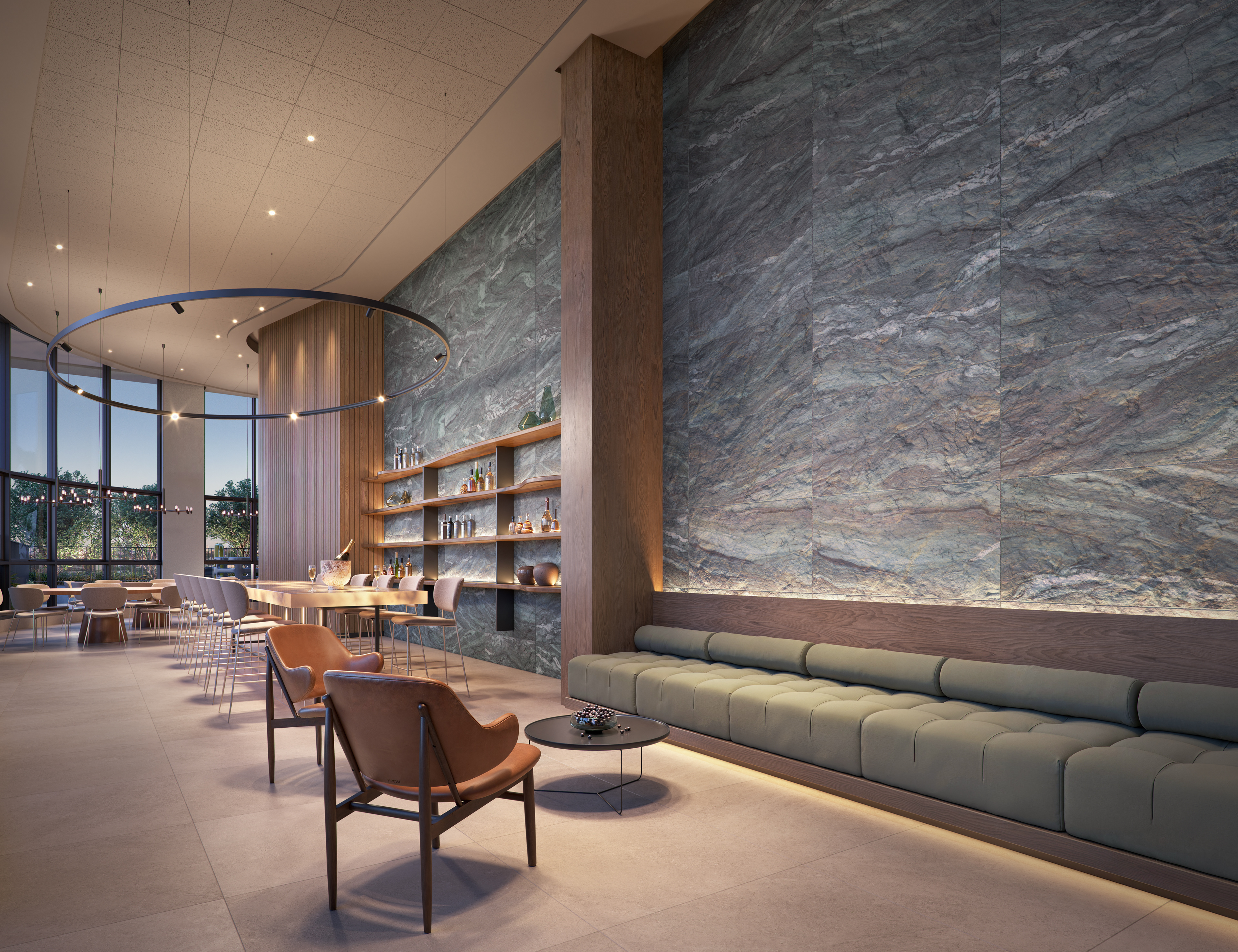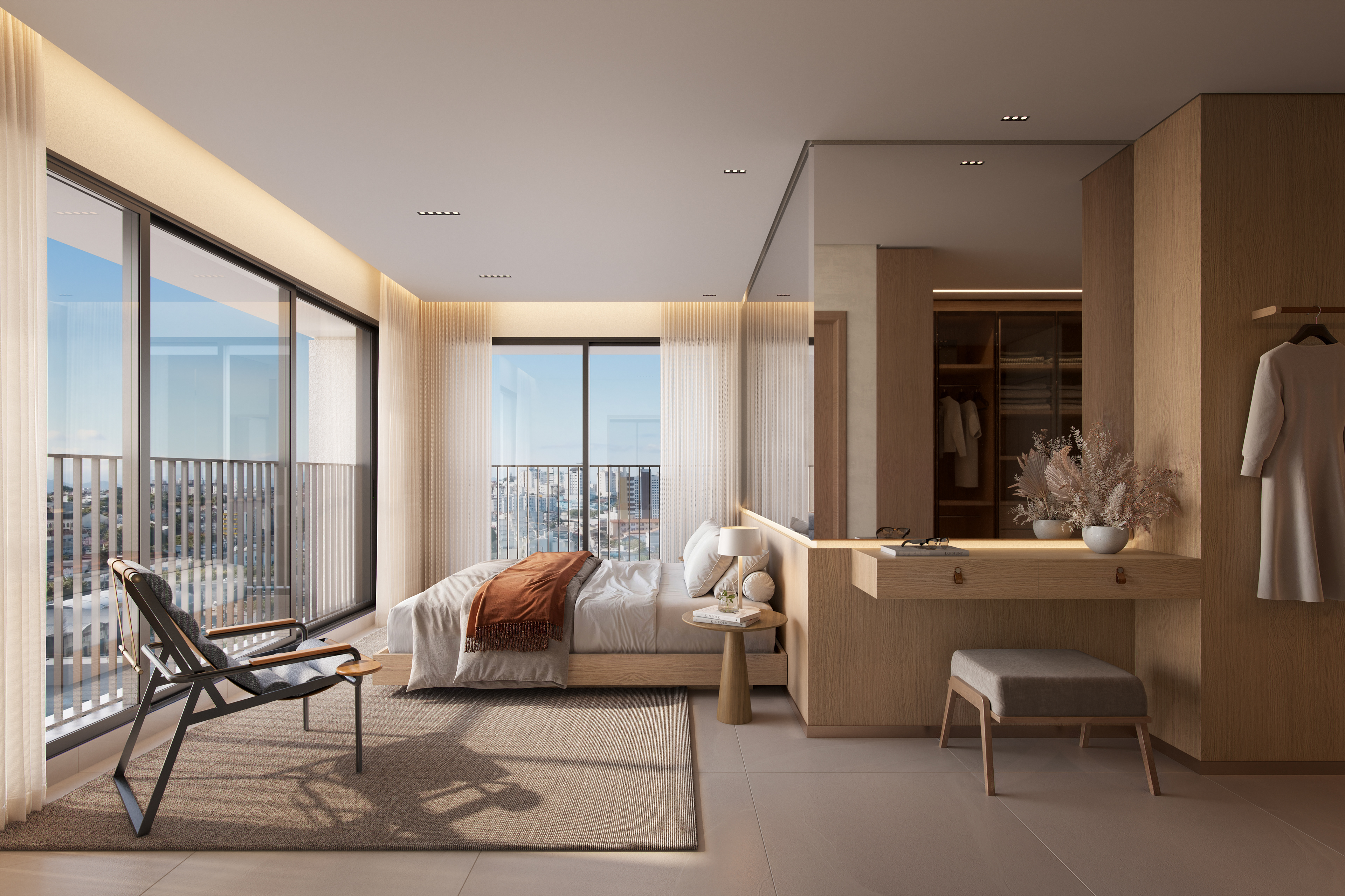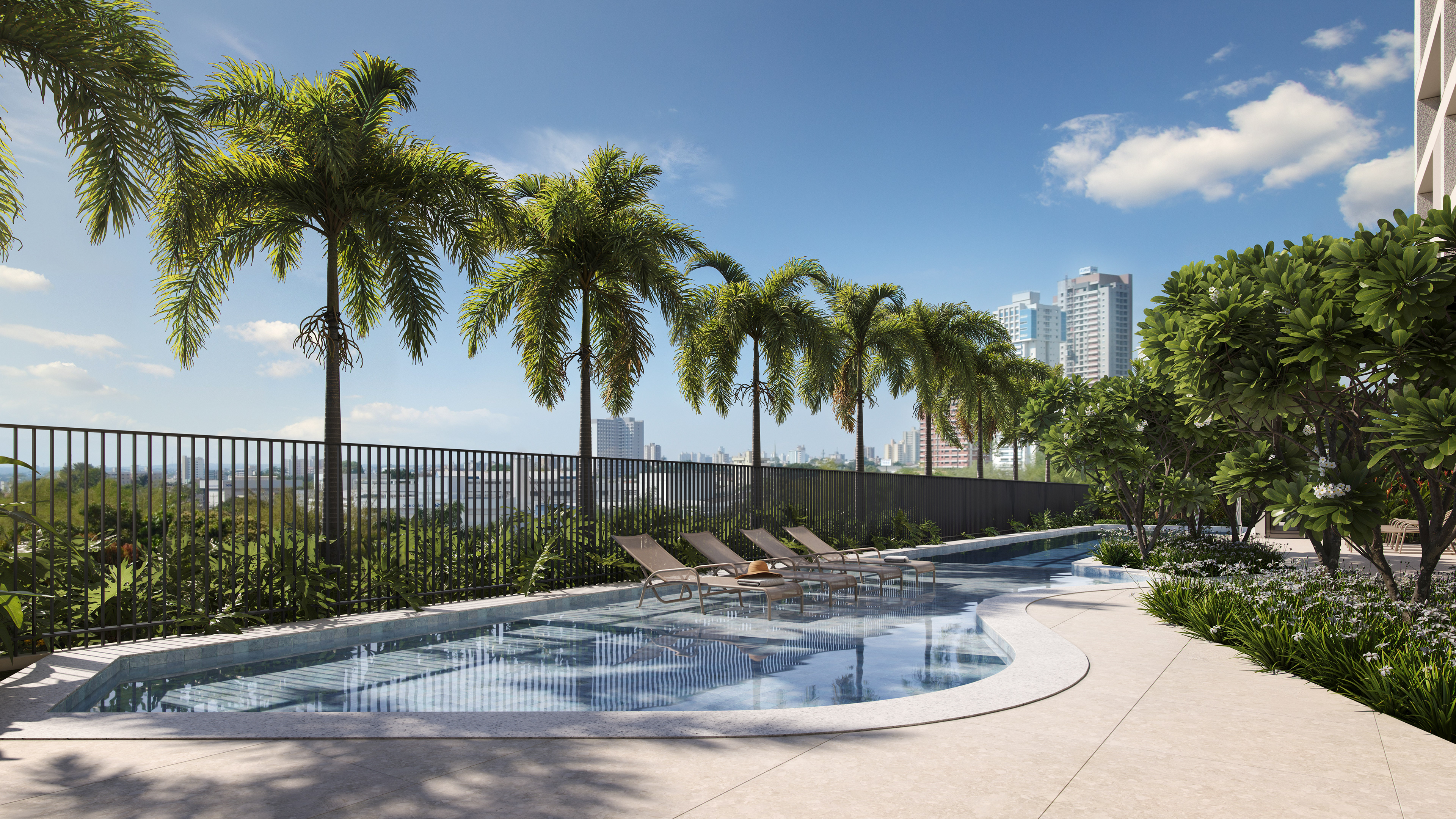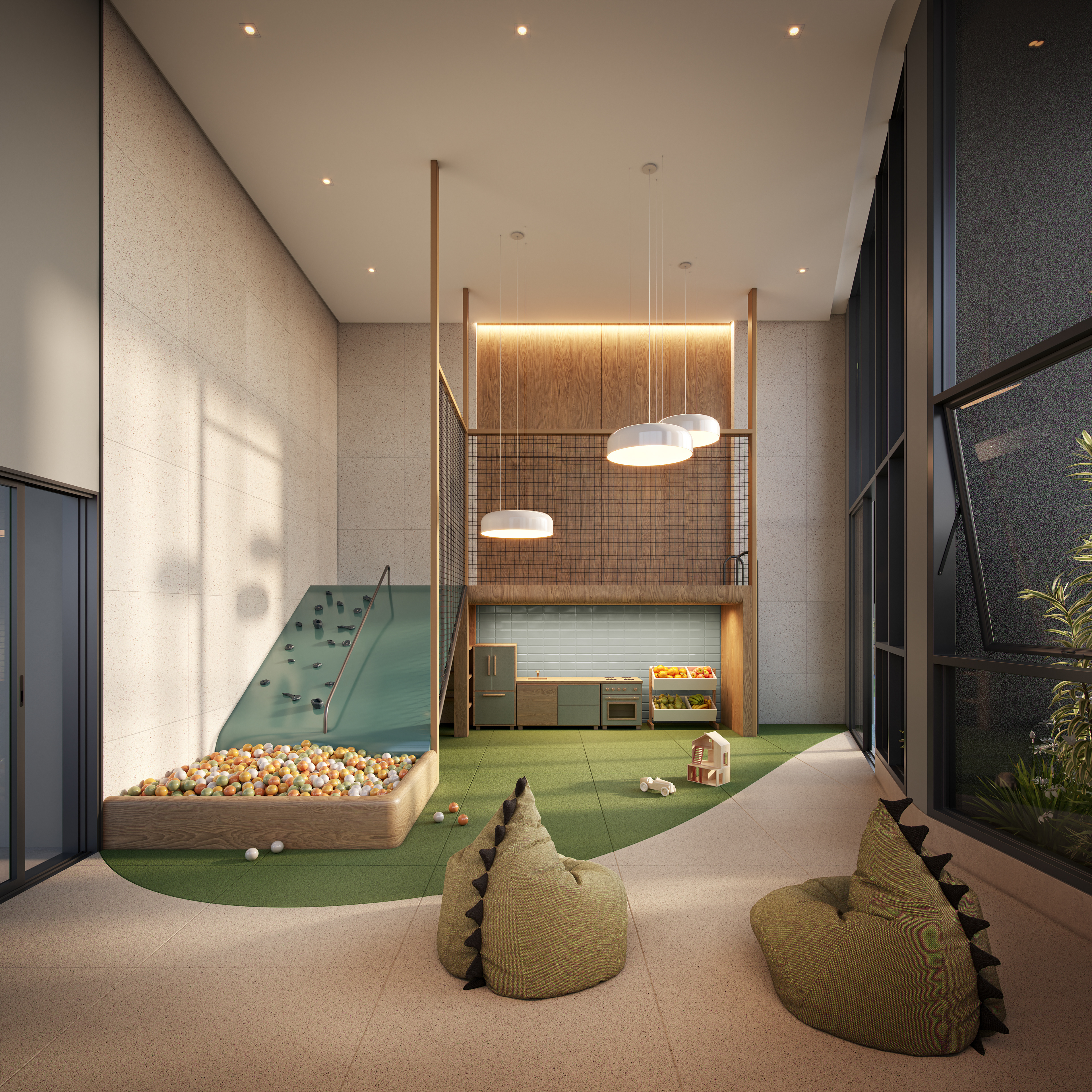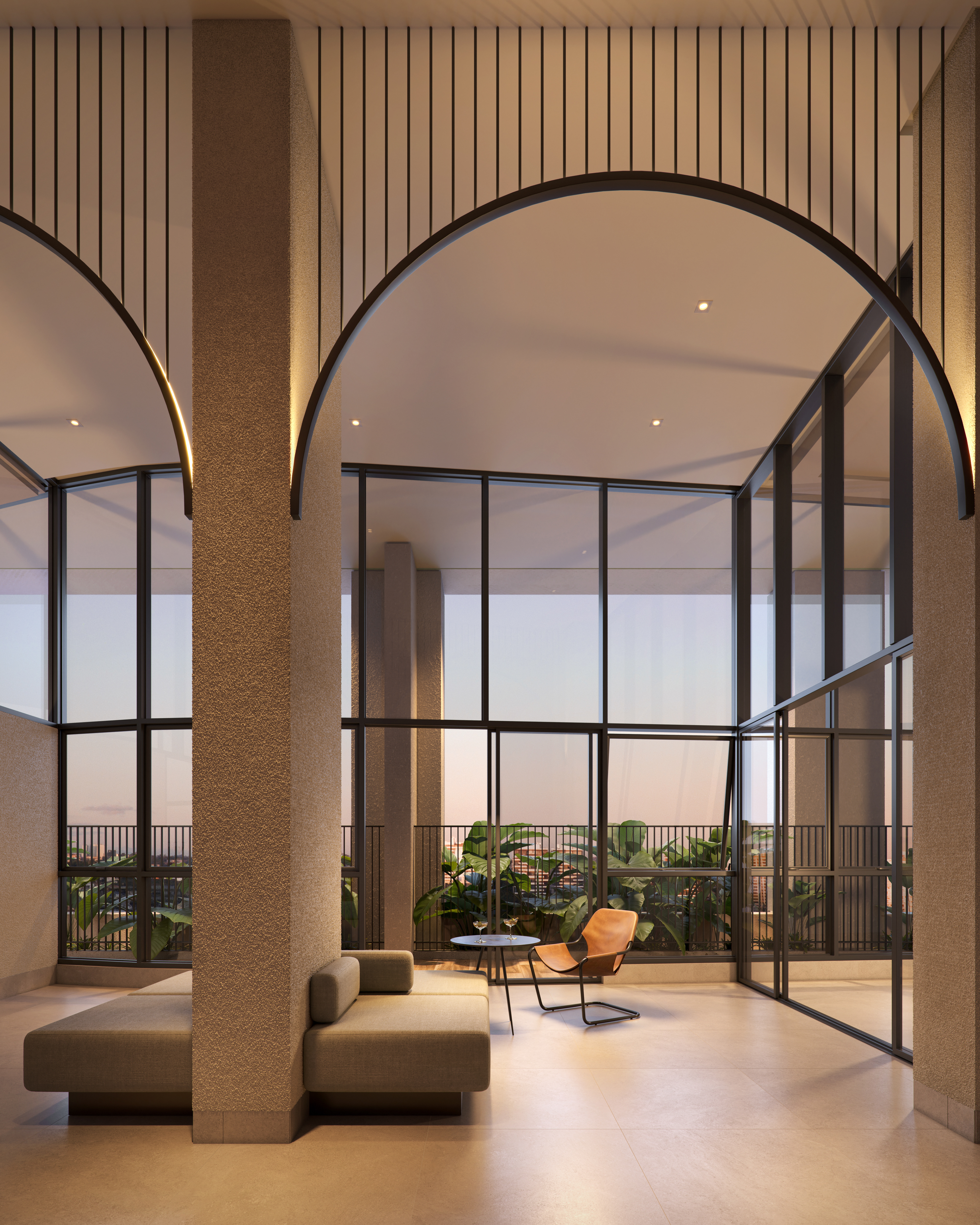 O que nos fascinou foi revelar a grandiosidade espacial que o projeto oferece. Pés-direitos duplos nas áreas comuns criam volumes generosos que precisavam ser comunicados visualmente sem perder intimidade. Trabalhamos ângulos que capturam a escala monumental do lazer, a amplitude vertical dos espaços sociais, a sensação de prestígio que apenas grandes alturas proporcionam.