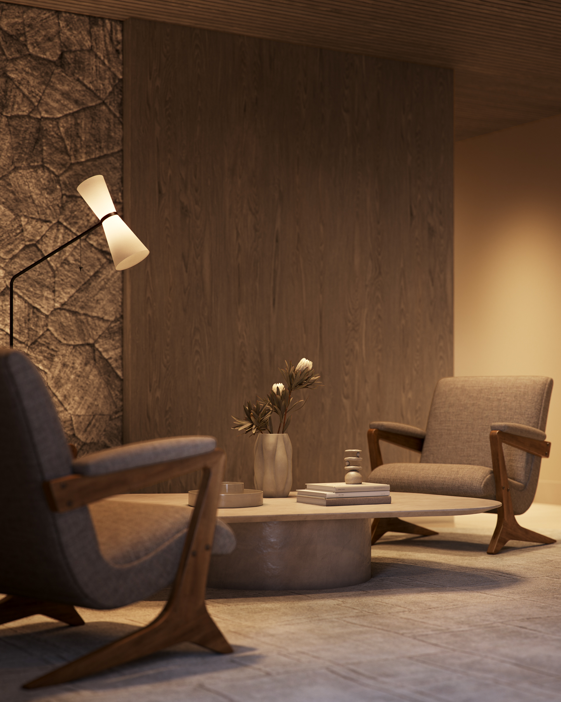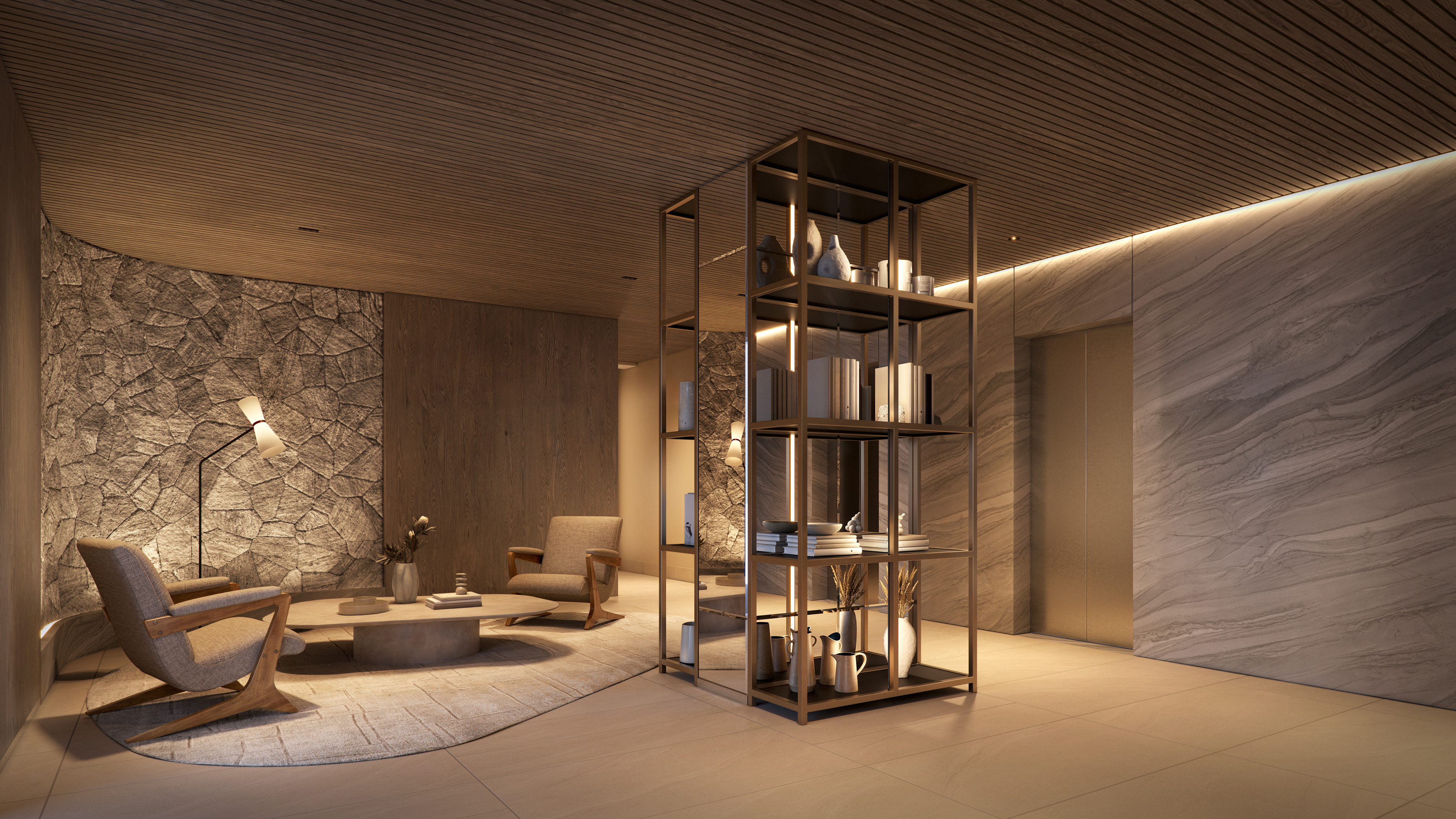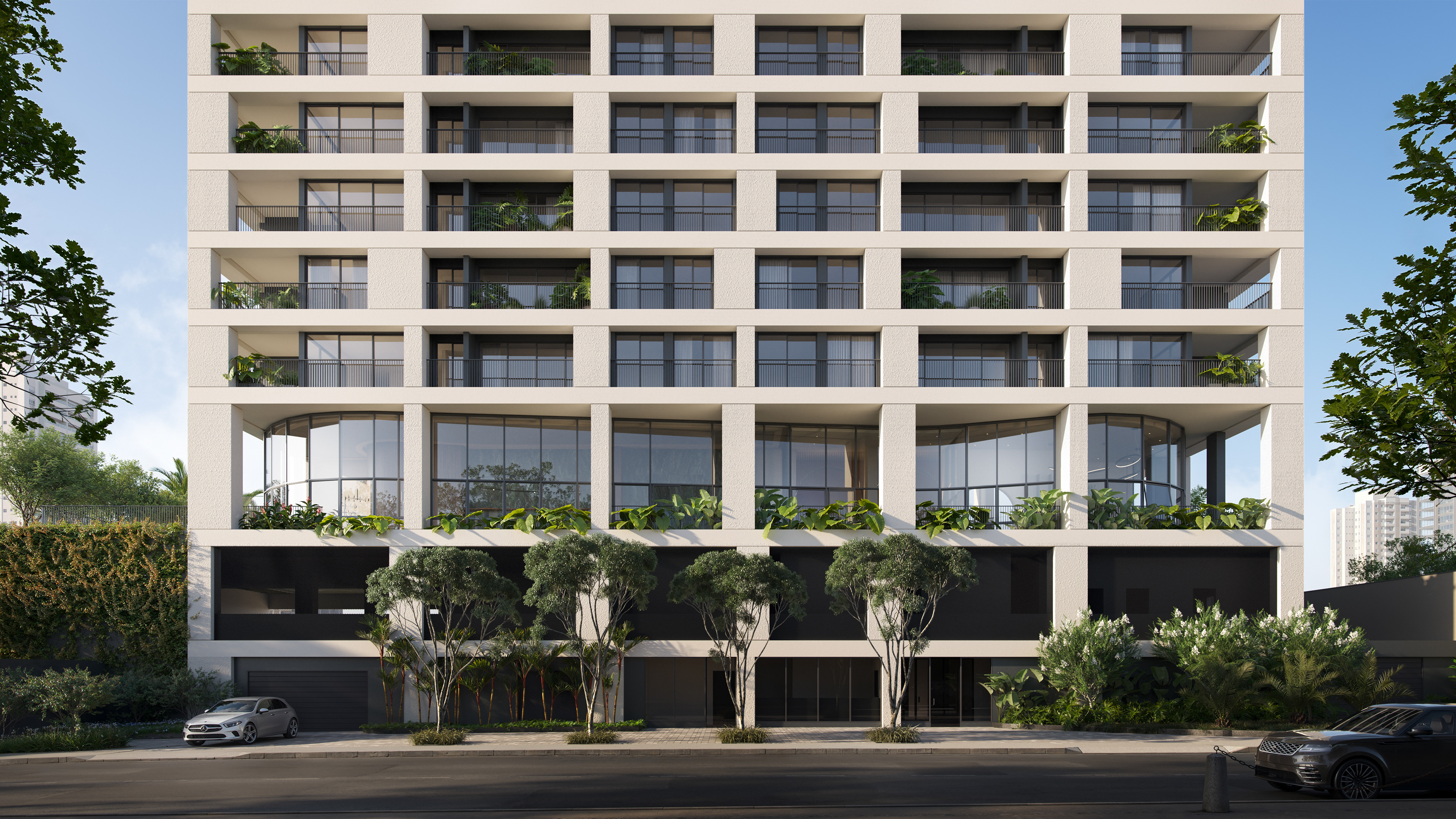 Nossa visão foi construída sobre a tensão entre peso e leveza, entre a monumentalidade bruta e a elegância refinada. A arquitetura quadrada, quase brutalista em sua honestidade volumétrica, trazia múltiplas texturas na fachada — um desafio técnico que exigiu atenção obsessiva aos detalhes. Trabalhamos cada superfície individualmente, garantindo que as variações de textura fossem legíveis mas sofisticadas, que comunicassem complexidade sem poluição visual.