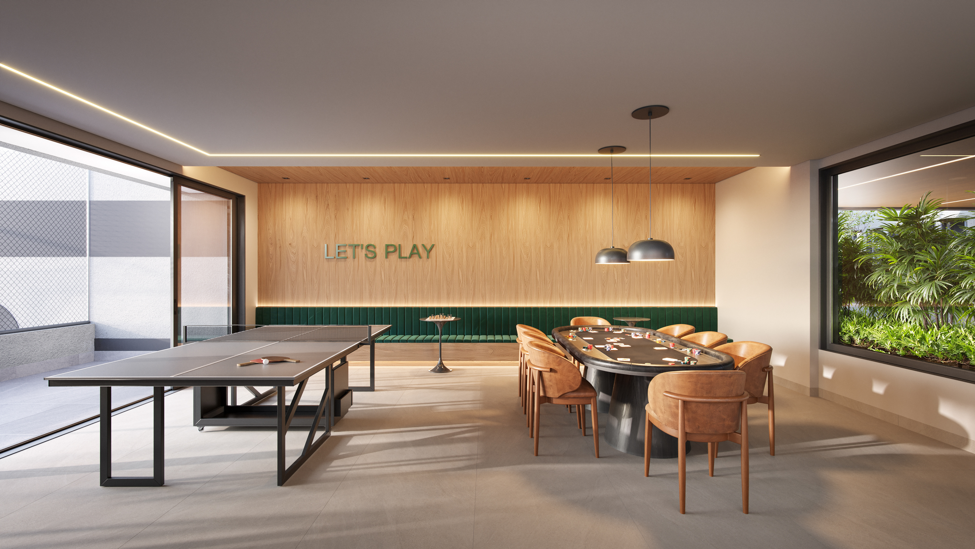 Seguimos diretriz rigorosa do cliente: mesmo ambientes internos — academia, salão de jogos, espaços de convívio — mantêm contato visual constante com vegetação exterior. Através de grandes aberturas, o verde invade visualmente cada cômodo, criando sensação de imersão permanente na natureza. Não é morar perto do verde, é morar cercado, envolvido, abraçado por ele.