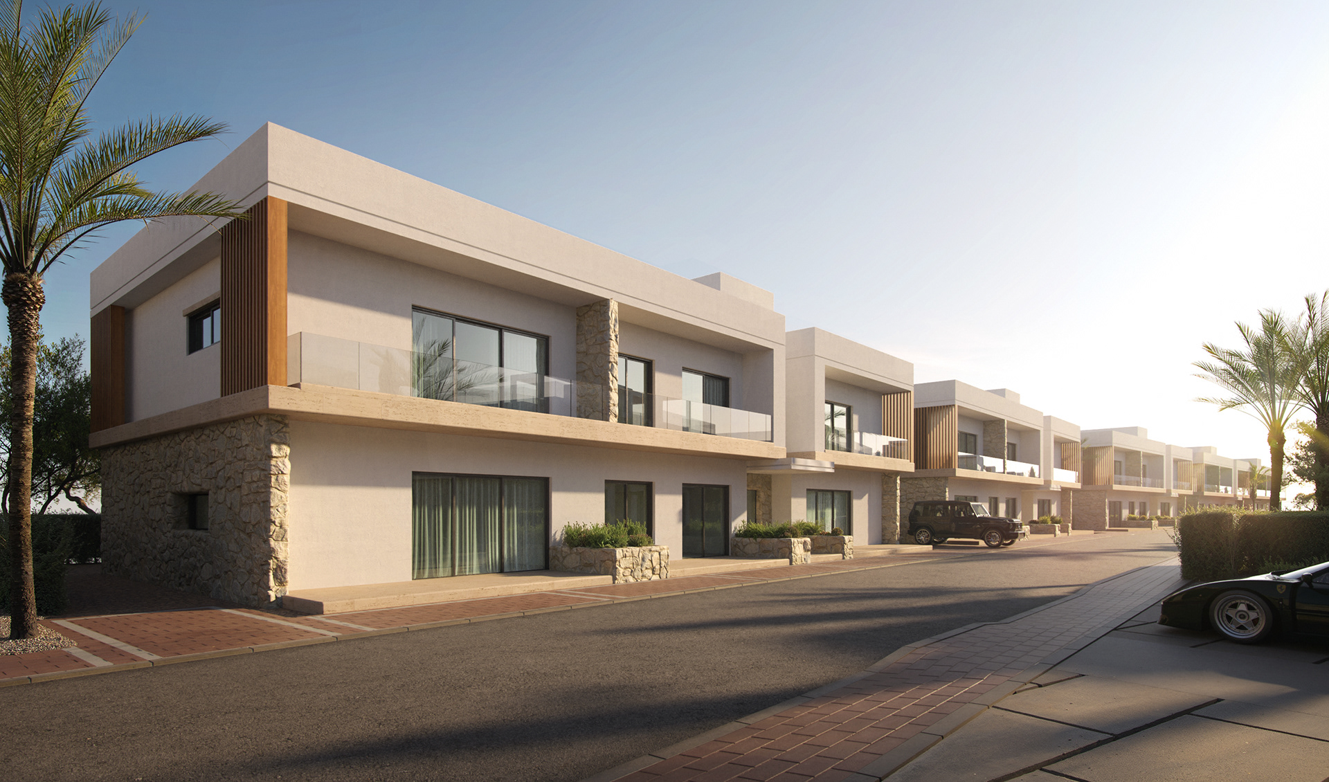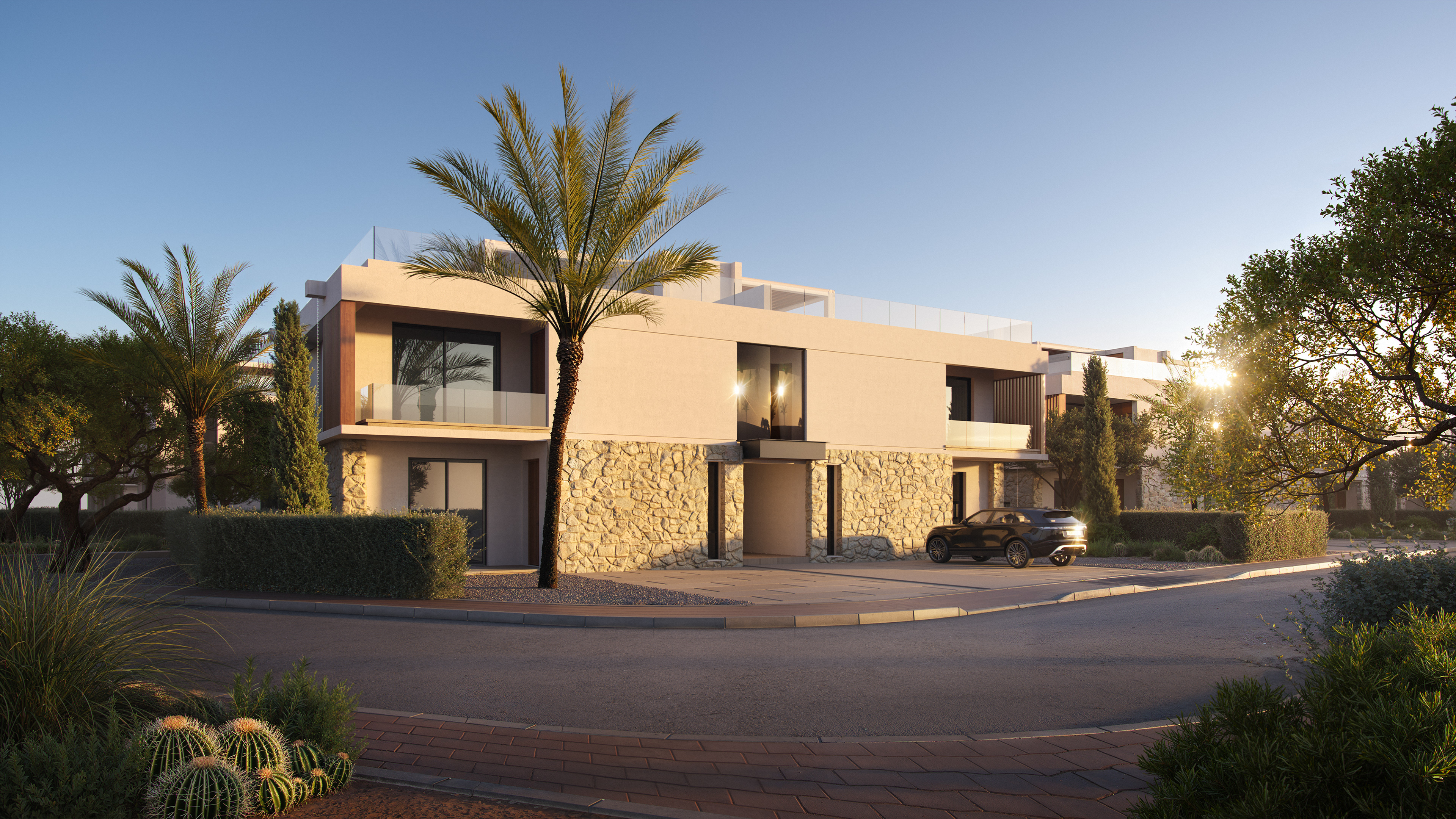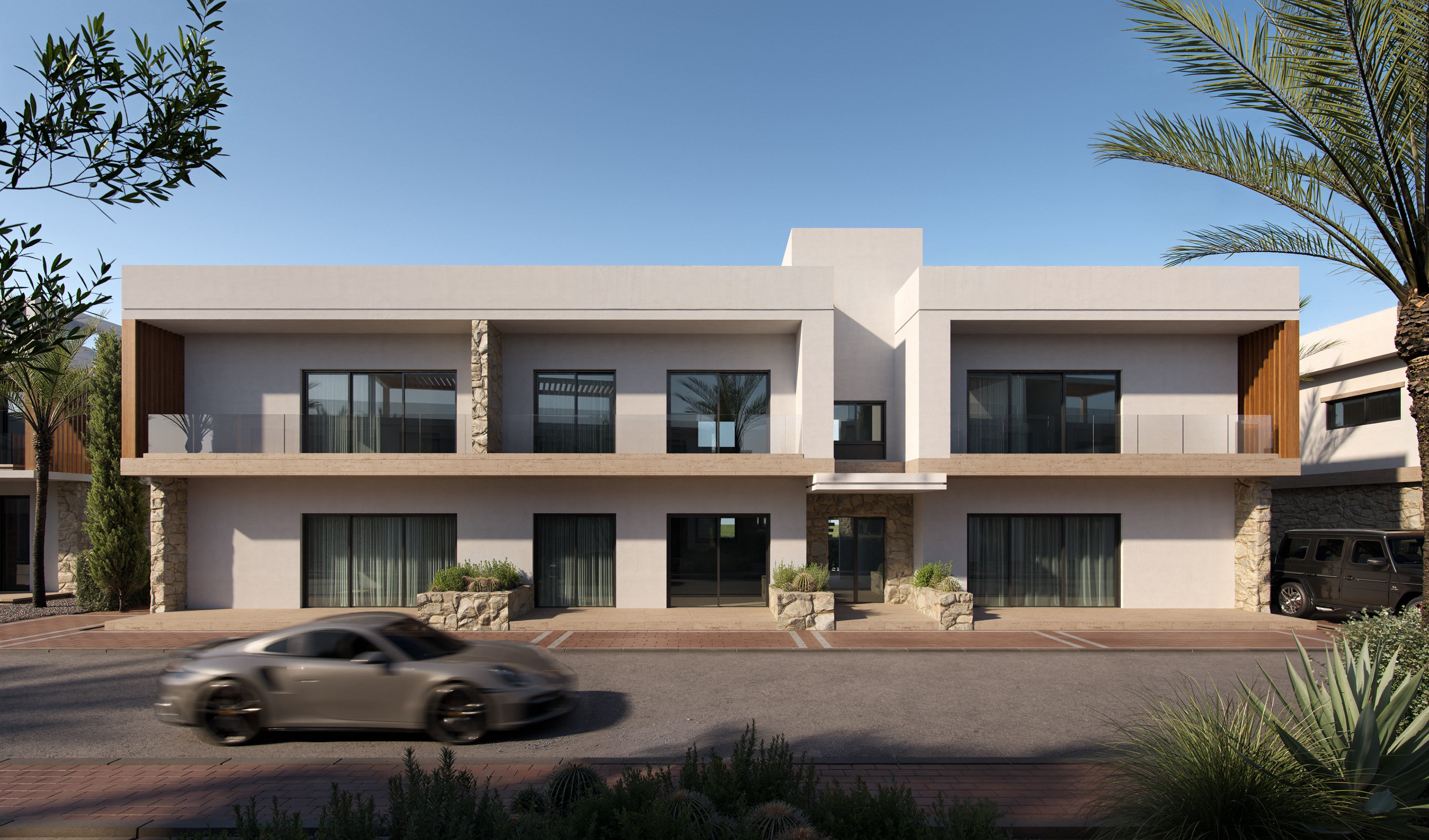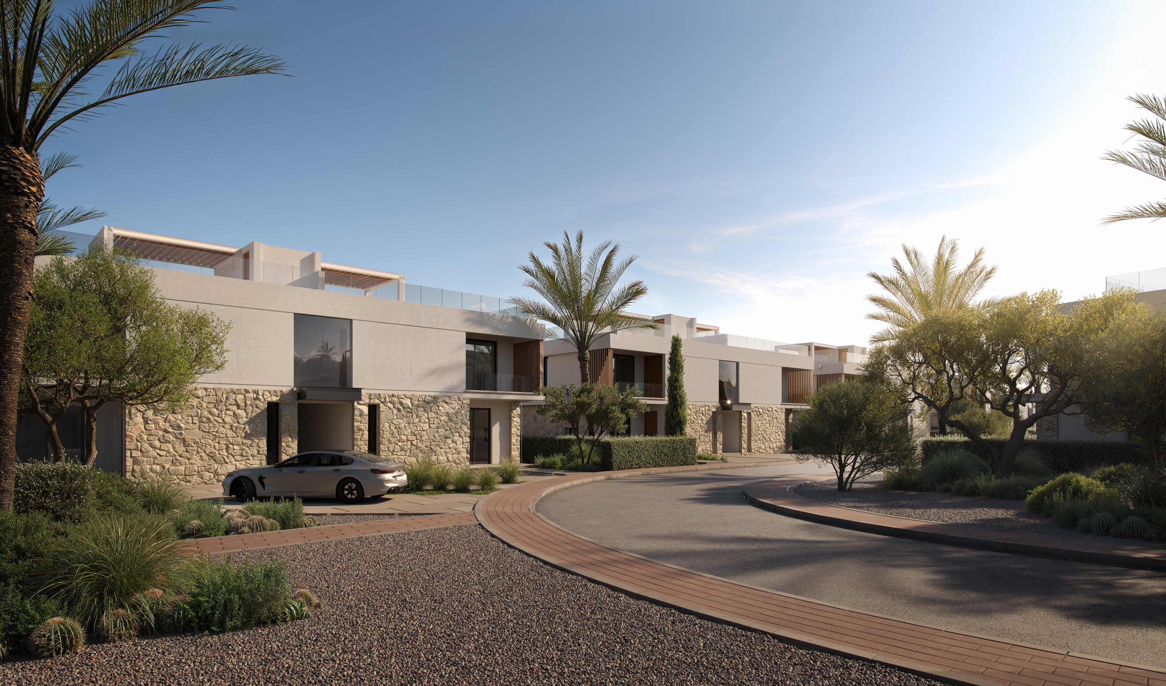 O desafio técnico era multifacetado: quatro tipologias residenciais distintas — casas menores para casais, maiores para famílias ampliadas — todas precisavam ser comunicadas visualmente com a mesma intensidade sedutora. Cada tipologia merecia protagonismo próprio, mas o conjunto precisava respirar coesão. Valorizar áreas comuns, revelar a proximidade marítima, capturar a essência mediterrânea autêntica através de paisagismo regional legítimo.